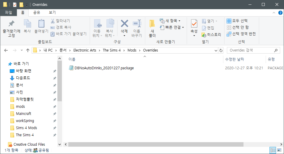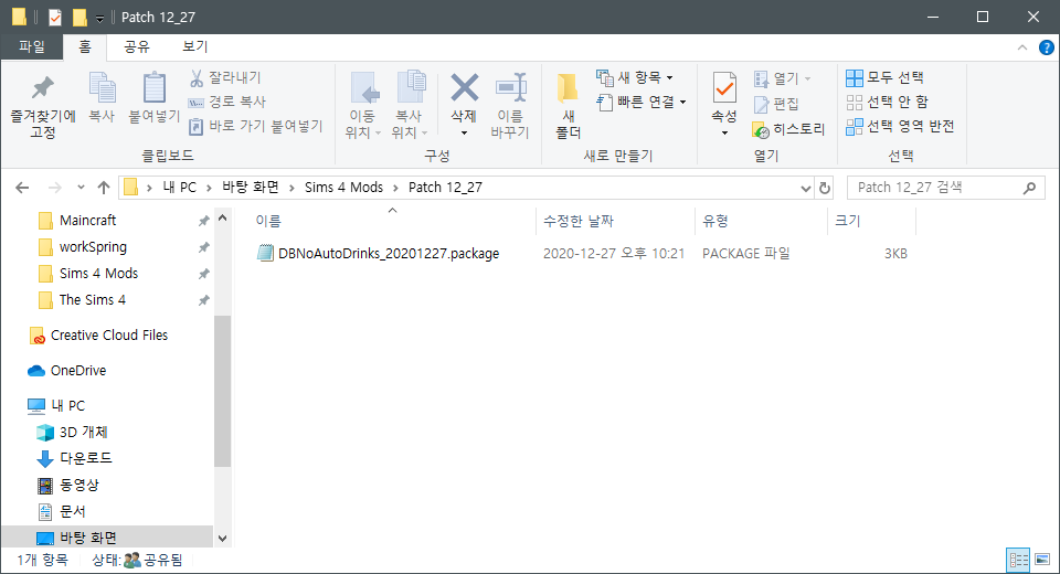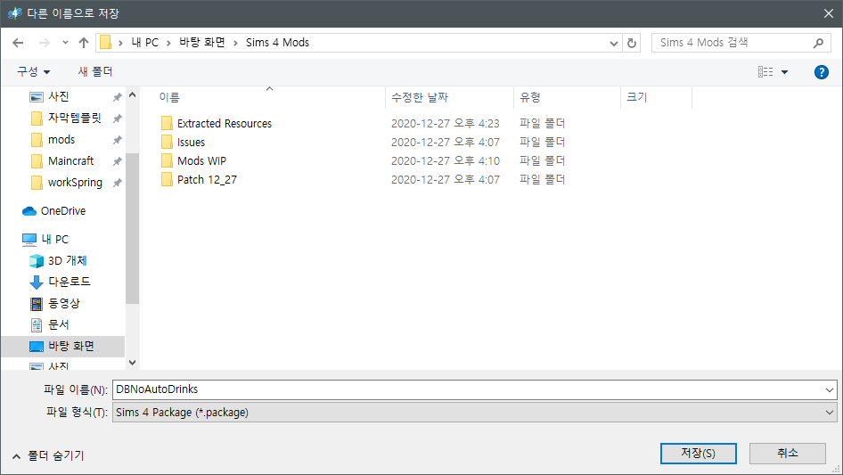 만약 테스트까지 끝내셨다면 백업 및 모드 버전 확인을 위해 패키지 파일을 Patch 폴더에 복사해서 붙여넣어주세요. (저는 모드를 만든 날짜도 확인하기 위해 패키지 이름에 적어줬습니다.)