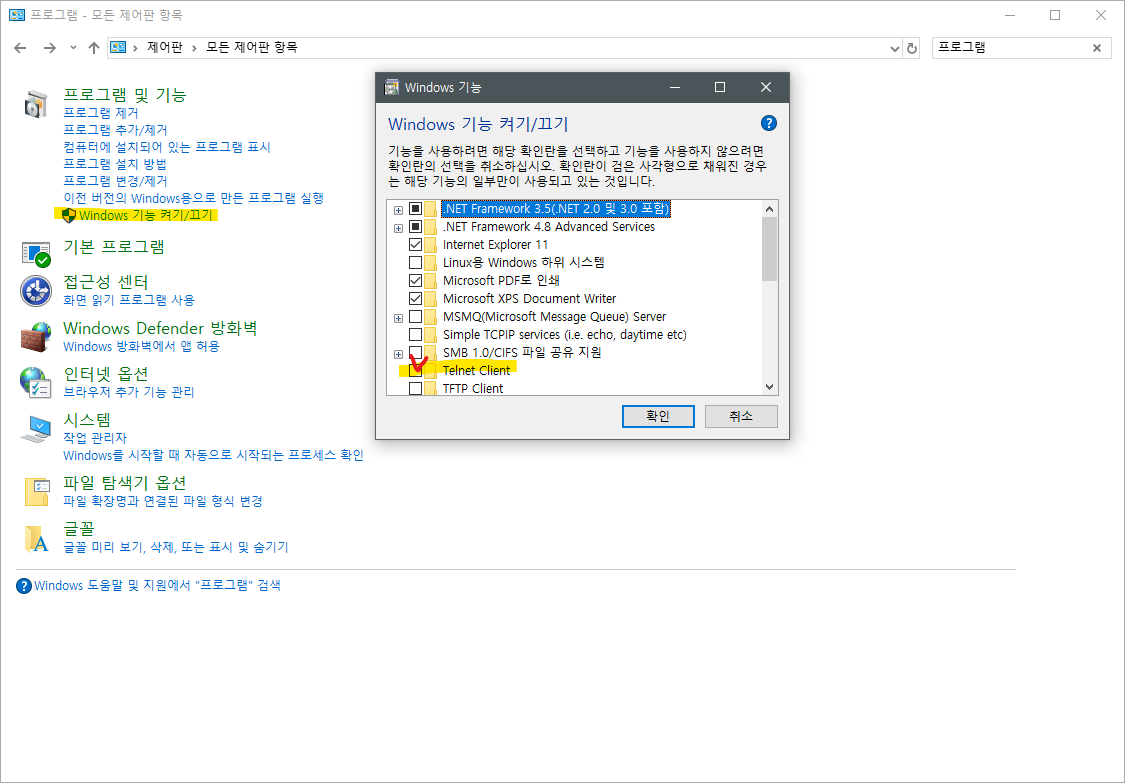 윈도우 시작 버튼 클릭 > 제어판 > Windows 기능 켜기/끄기 > Telnet Client 체크 후 확인