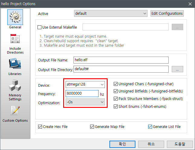 AVR GCC 선택 - 프로젝트 이름 입력 - Create folder 체크 - 프로젝트 디렉토리 지정 - Finish