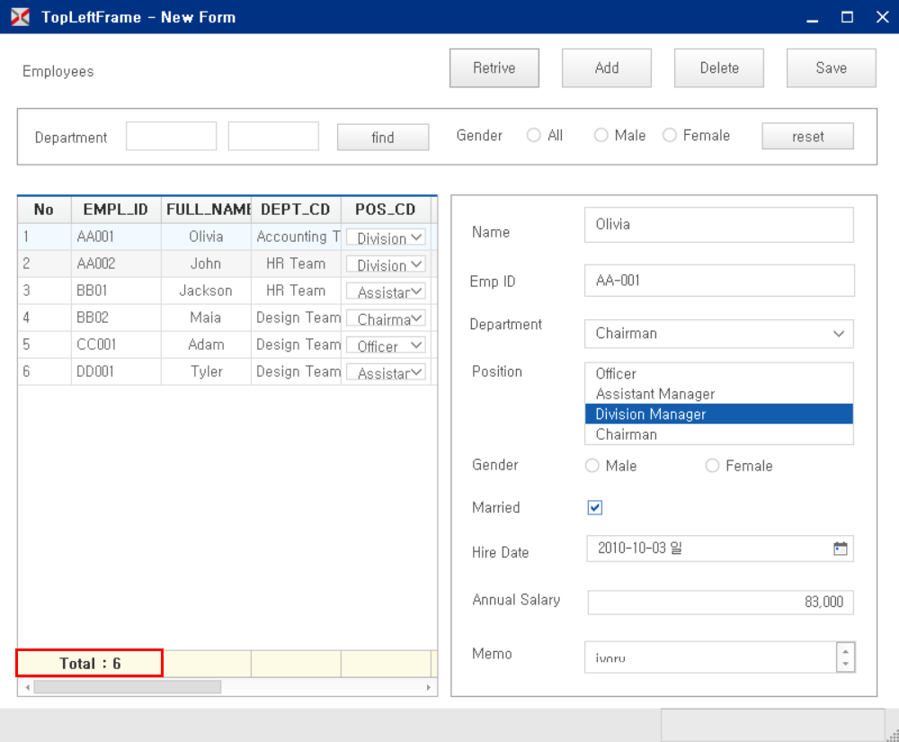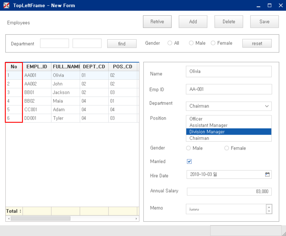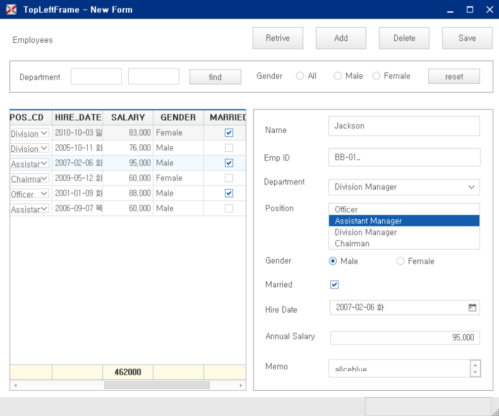 /*저장--------------------------------------------------------------*/ this.fn_save = function(obj:nexacro.Button,e:nexacro.ClickEventInfo) { var sTitle = nexacro.wrapQuote(this.titletext); this.transaction("savSave" ,"SvcURL::save_emp.jsp" ,"in_emp=ds_emp:u" //서버에 있는 emp에 데이터를 넣겠다는 뜻, U는 갱신된 데이터만 가져오겠다는 뜻 ,"" ,"in_val1="+sTitle ,"fn_callback"); };해당 함수를 작성해줌으로써 Add-정보입력-Save 버튼을 진행했을때 아래처럼 저장되고 조회가 가능하다