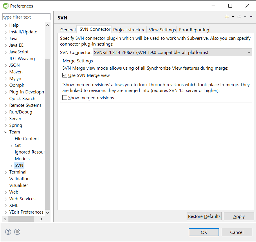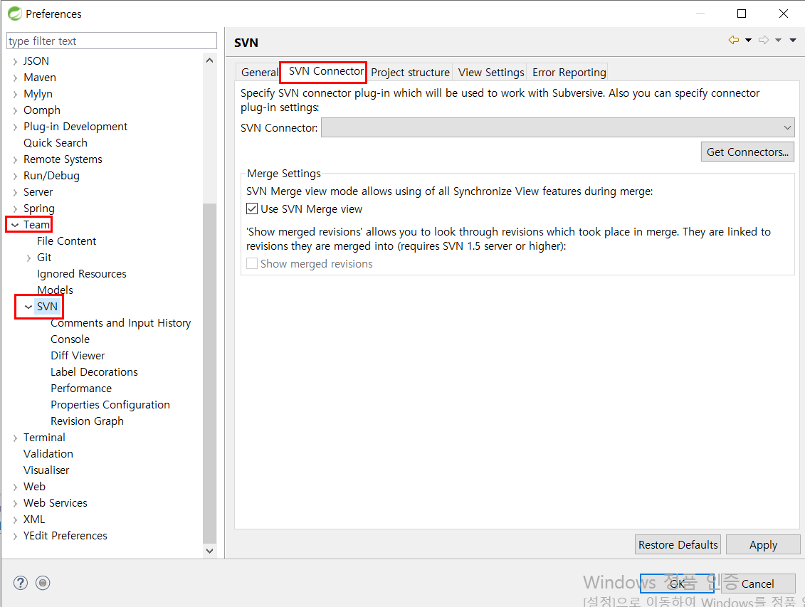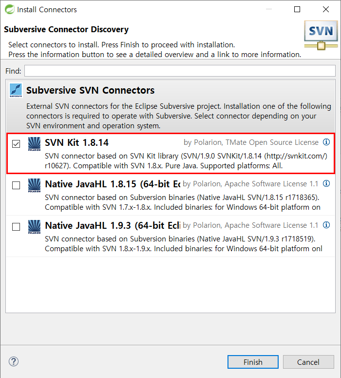 이 화면이 뜰 경우 Window - Preference - Team - SVN - SVN Connector - Get Connector 로