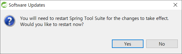 STS 버전에 따라 나오지 않을 수 있다. 현재 3.8.4 버전 사용중. 다운로드가 완료되면 Restart 하겠느냐고 뜸.