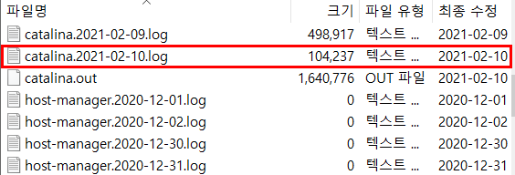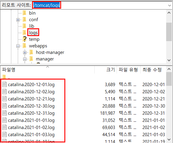 서버에서 로그파일을 직접 받으려면 우선 파일질라의 /tomcat/logs 디렉토리로 가야한다.