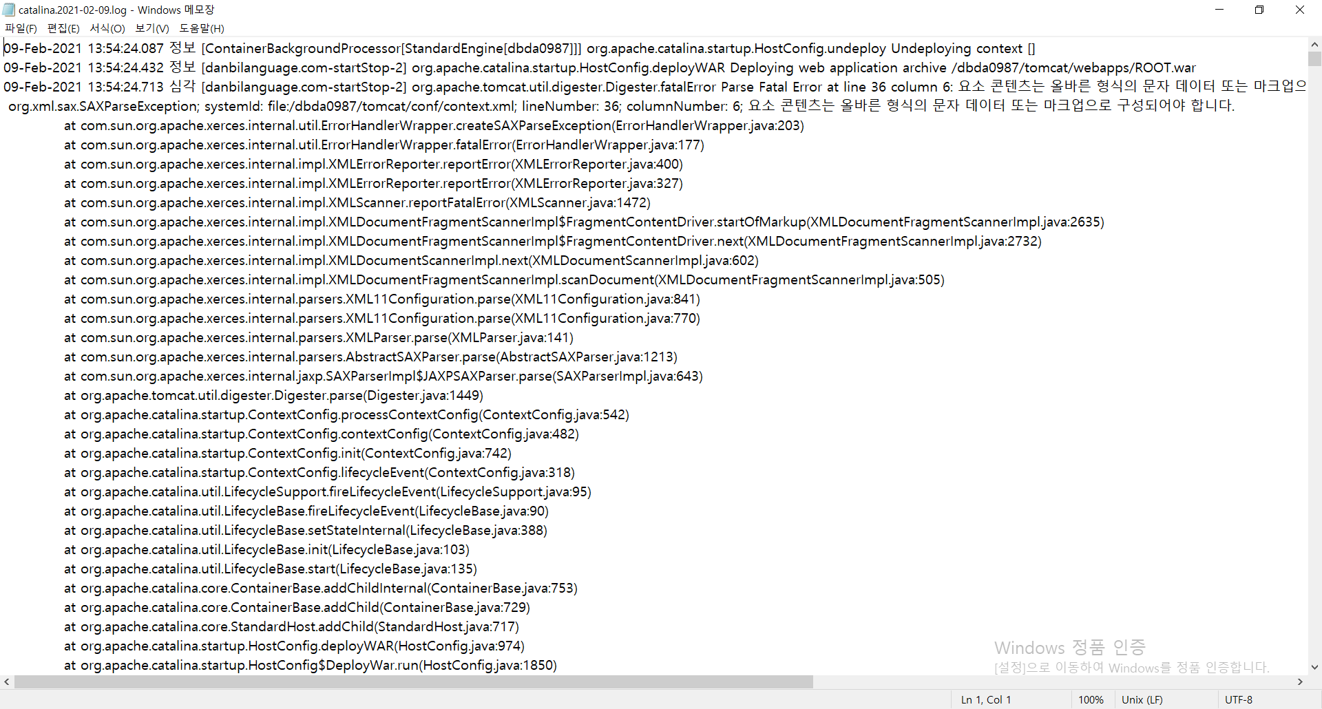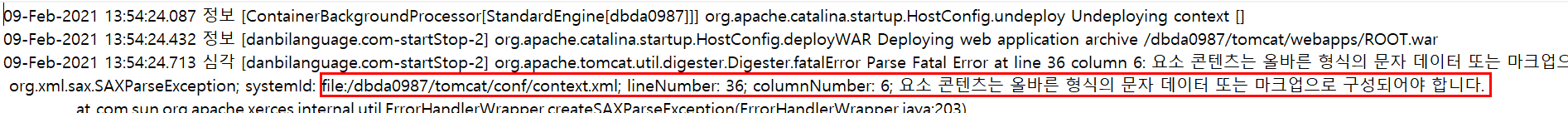 이제 에러의 원인을 꼼꼼히 찾아본다. 문제의 원인이 context.xml에 있는것 같다.