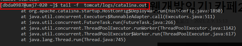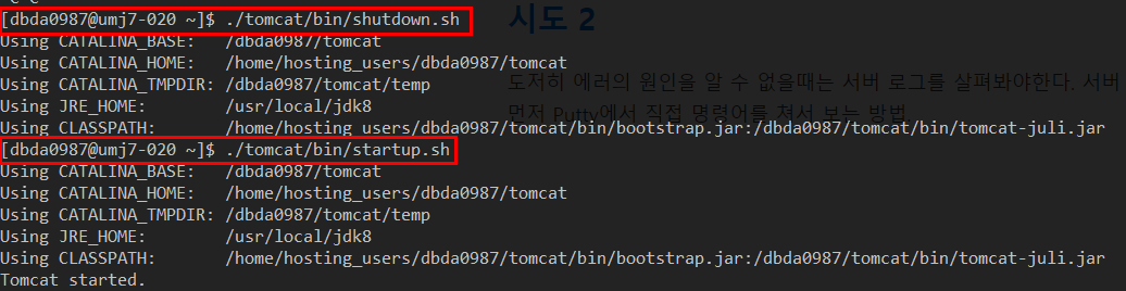 먼저 Putty에서 직접 명령어를 쳐서 보는 방법으로는, 아래처럼 톰캣 구동을 껐다가 다시 킨 후