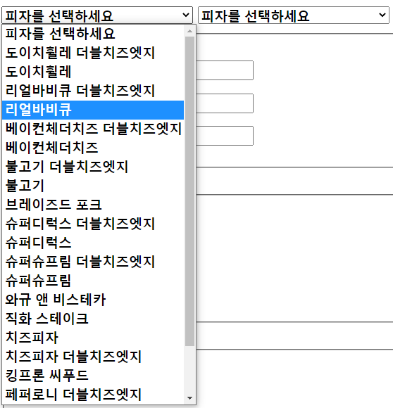 <!DOCTYPE html PUBLIC "-//W3C//DTD HTML 4.01 Transitional//EN" "http://www.w3.org/TR/html4/loose.dtd"> <html> <head> <meta http-equiv="Content-Type" content="text/html; charset=UTF-8"> <title>[pizza_form.html]</title> <style type="text/css"> *{ font-size:14pt; font-weight:bold; } .relative { position: relative; width: 427px; height: 180px; background-image: url('pizza_images/bgpizza.jpg'); background-position: top left; } .absolute { position: absolute; top: 0; right: 0; width: 213px; height: 180px; background-image: url('pizza_images/bgpizza.jpg'); background-position: top right; } </style> <script type="text/javascript"> function changePizzaL(name) { document.getElementById("preview_l").style.backgroundImage = "url('pizza_images/"+ name +".jpg')"; } function changePizzaR(name) { document.getElementById("preview_r").style.backgroundImage = "url('pizza_images/"+ name +".jpg')"; } </script> </head> <body> <div id="preview_l" class="relative"> <div id="preview_r" class="absolute"> </div> </div> <p> <form action="" method="post"> <select name="pizzaListLeft" onchange="changePizzaL(this.value)"> <option value="bgpizza" selected="selected">피자를 선택하세요</option> <option value="dw_d">도이치휠레 더블치즈엣지</option> <option value="dw">도이치휠레</option> <option value="rb_d">리얼바비큐 더블치즈엣지</option> <option value="rb">리얼바비큐</option> <option value="qcc_d">베이컨체더치즈 더블치즈엣지</option> <option value="bcc">베이컨체더치즈</option> <option value="bgg_d">불고기 더블치즈엣지</option> <option value="bgg">불고기</option> <option value="bp">브레이즈드 포크</option> <option value="sd_d">슈퍼디럭스 더블치즈엣지</option> <option value="sd">슈퍼디럭스</option> <option value="ss_d">슈퍼슈프림 더블치즈엣지</option> <option value="ss">슈퍼슈프림</option> <option value="wnb">와규 앤 비스테카</option> <option value="fs">직화 스테이크</option> <option value="cp">치즈피자</option> <option value="cp_d">치즈피자 더블치즈엣지</option> <option value="ks">킹프론 씨푸드</option> <option value="ppr_d">페퍼로니 더블치즈엣지</option> <option value="ppr">페퍼로니</option> <option value="pt_d">포테이토 더블치즈엣지</option> <option value="pt">포테이토</option> </select> <select name="pizzaListRight" onchange="changePizzaR(this.value)"> <option value="bgpizza" selected="selected">피자를 선택하세요</option> <option value="dw_d">도이치휠레 더블치즈엣지</option> <option value="dw">도이치휠레</option> <option value="rb_d">리얼바비큐 더블치즈엣지</option> <option value="rb">리얼바비큐</option> <option value="qcc_d">베이컨체더치즈 더블치즈엣지</option> <option value="bcc">베이컨체더치즈</option> <option value="bgg_d">불고기 더블치즈엣지</option> <option value="bgg">불고기</option> <option value="bp">브레이즈드 포크</option> <option value="sd_d">슈퍼디럭스 더블치즈엣지</option> <option value="sd">슈퍼디럭스</option> <option value="ss_d">슈퍼슈프림 더블치즈엣지</option> <option value="ss">슈퍼슈프림</option> <option value="wnb">와규 앤 비스테카</option> <option value="fs">직화 스테이크</option> <option value="cp">치즈피자</option> <option value="cp_d">치즈피자 더블치즈엣지</option> <option value="ks">킹프론 씨푸드</option> <option value="ppr_d">페퍼로니 더블치즈엣지</option> <option value="ppr">페퍼로니</option> <option value="pt_d">포테이토 더블치즈엣지</option> <option value="pt">포테이토</option> </select> <fieldset> <legend>필수항목입력</legend> <p><label>고객명 <input type="text" palceholder="홍길동"></label></p> <p><label>전화번호 <input type="tel" palceholder="-제외하고 입력"></label></p> <p><label>E-mail <input type="email"></label></p> </fieldset> <br> <fieldset> <legend>피자 사이즈</legend> <p><label><input type="radio" name="size">Small</label></p> <p><label><input type="radio" name="size">Medium</label></p> <p><label><input type="radio" name="size">Large</label></p> </fieldset> <br> <fieldset> <legend>토핑 선택</legend> <p><label><input type="checkbox">베이컨</label></p> <p><label><input type="checkbox">치즈</label></p> <p><label><input type="checkbox">양파</label></p> <p><label><input type="checkbox">버섯</label></p> </fieldset> <p> <label>희망배송시간 <input type="time" min="10:00" max="22:00" step="900"> </label> </p> <p> <label>배송시요청사항 <textarea name="comments" maxlength="1000" rows="2" cols="30" style="vertical-align:middle; resize:none;"> </textarea> </label> </p> <p><button>피자주문하기</button></p> </form> </body> </html>'FRONT-END > Javascript' 카테고리의 다른 글