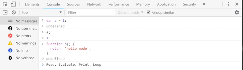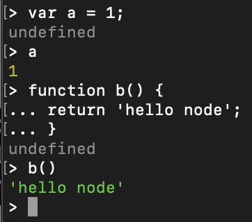 > var a = 1; > a 1 > function b() { ... return 'hello node'; } > b() 'hello node' >코드 앞에 > 가 표시되어 있는데 이것은 웹브라우저에서 F12를 눌렀을때 나오는 콘솔에 입력하면 나오는 화면과 똑같다.