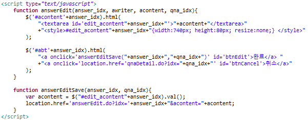 <!-- jQuery CDN --> <script src="http://code.jquery.com/jquery-3.4.1.min.js"></script> <script type="text/javascript"> function answerEdit(answer_idx, awriter, acontent, qna_idx){ $('#acontent'+answer_idx).html( "<textarea id='edit_acontent"+answer_idx+"'>"+acontent+"</textarea>" +"<style>#edit_acontent"+answer_idx+"{width:740px; height:80px; resize:none;} </style>" ); $('#abt'+answer_idx).html( "<a onclick='answerEditSave("+answer_idx+","+qna_idx+")' id='btnEdit'>완료</a> " +"<a onclick='location.href='qnaDetail.do?idx="+qna_idx+"' id='btnCancel'>취소</a>" ); } function answerEditSave(answer_idx, qna_idx){ var acontent = $("#edit_acontent"+answer_idx).val(); location.href='answerEdit.do?idx='+answer_idx+"&acontent="+acontent; } </script>'FRONT-END > jQuery' 카테고리의 다른 글