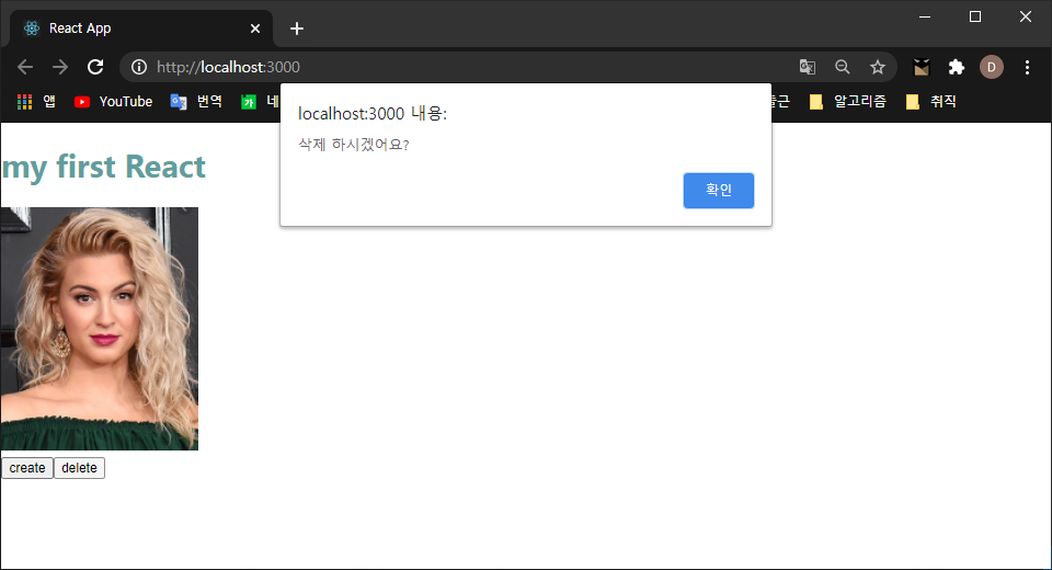 handleDelete import React from 'react' import logo from './logo.svg'; import './App.css'; import './css/mystyle.css' import my from './images/torikelly.png' export default class App extends React.Component{ handleDelete = () => { alert('삭제 하시겠어요?'); } handleCreate(){ console.log('handleCreate 함수'); alert('신규등록을 하시겠어요?'); } render(){ //javascript 기술하는 영역 //상수,함수,전역변수 return( <div> <h1>my first React</h1> <img src={my} alt='토리켈리' width='200'/><br></br> <button onClick={this.handleCreate}>create</button> <button onClick={this.handleDelete}>delete</button> </div> )//return end }//render end }//class end'FRONT-END > React' 카테고리의 다른 글