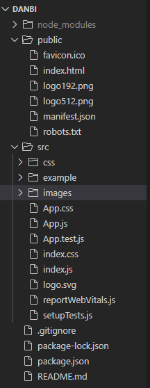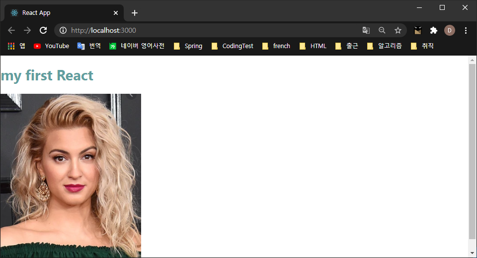 import React from 'react' import logo from './logo.svg'; import './App.css'; import './css/mystyle.css' import my from './images/torikelly.png' export default class App extends React.Component{ render(){ //javascript 기술하는 영역 //상수,함수,전역변수 return( <div> <h1>my first React</h1> <img src={my} alt='토리켈리'/> </div> )//return end }//render end }//class end| 현재 폴더 구조
