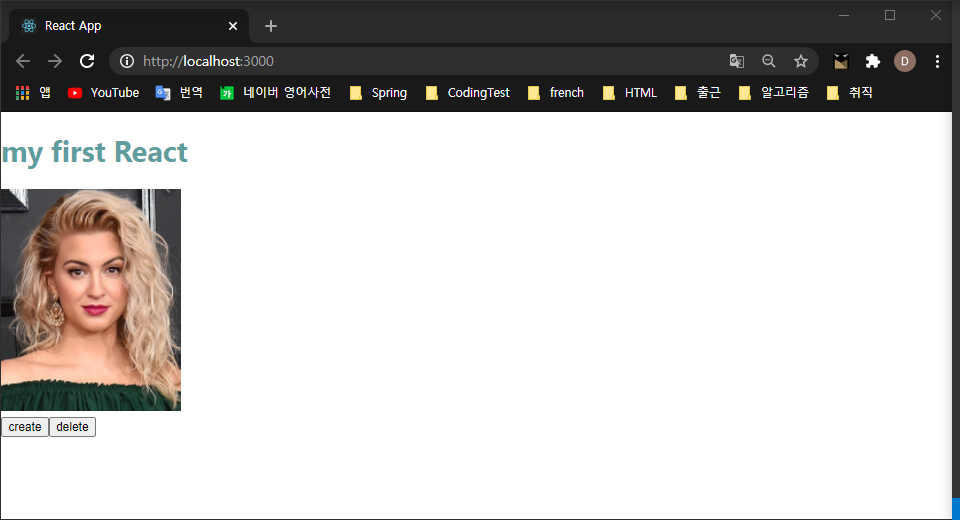 import React from 'react' import logo from './logo.svg'; import './App.css'; import './css/mystyle.css' import my from './images/torikelly.png' export default class App extends React.Component{ handleDelete = () => { alert('삭제 하시겠어요?'); } handleCreate = () => { console.log('handleCreate 함수'); alert('신규등록을 하시겠어요?'); } render(){ //javascript 기술하는 영역 //상수,함수,전역변수 return( <div> <h1>my first React</h1> <img src={my} alt='토리켈리' width='200'/><br></br> <button onClick='handleCreate'>create</button> <button onClick='handleDelete'>delete</button> </div> )//return end }//render end }//class end| 버튼으로 함수 호출하기