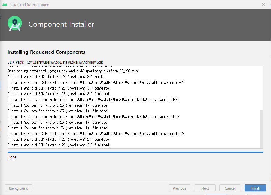 | 다운로드가 끝나고 Finish 버튼이 활성화 되면 눌러준다.