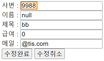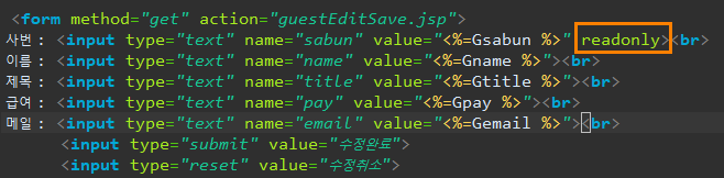 먼저, guestEdit에 있는 사번칸을 조금 수정해주었습니다. 사번값은 데이터베이스에서 절대 변경이 되지 않는 Primary Key 이기 때문에 form 태그의 readonly 속성을 붙여서 사용자가 수정하지 못하도록 했습니다. 사용자가 사번칸을 클릭해도 커서가 사번칸 안으로 들어가지 않고 보기만 할 수 있어요!