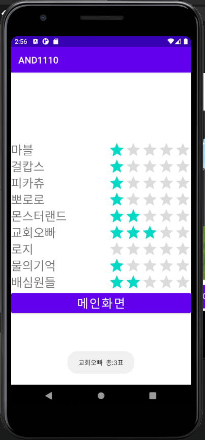 package com.example.and1110; import android.content.Intent; import android.os.Bundle; import android.view.View; import android.widget.Button; import android.widget.ImageView; import android.widget.Toast; import androidx.appcompat.app.AppCompatActivity; public class MainActivity extends AppCompatActivity { int count[]=new int[9]; //누적수 ImageView iv[]=new ImageView[9]; int imageID[]={ R.id.iv1, R.id.iv2,R.id.iv3, R.id.iv4, R.id.iv5,R.id.iv6, R.id.iv7, R.id.iv8,R.id.iv9 }; String imgMsg[]={ "마블", "걸캅스", "피카츄", "뽀로로", "몬스터랜드", "교회오빠","로지","물의기억", "배심원들" }; Button btn; //투표결과 public void onCreate(Bundle savedInstanceState) { super.onCreate(savedInstanceState); setContentView(R.layout.activity_main); //count배열초기화 for(int i=0; i<count.length;i++){count[i]=0;} for(int i=0; i<imageID.length; i++){ final int index=i; iv[i]=findViewById(imageID[i]); iv[i].setOnClickListener(new View.OnClickListener() { public void onClick(View v) { //count[i]++; for반복문안에 있는 i 쓰면 에러발생 count[index]++; Toast tt=Toast.makeText(getApplication(), imgMsg[index]+" 총:"+count[index]+"표" , Toast.LENGTH_SHORT); tt.show(); } }); }//그림관련 for end btn=findViewById(R.id.btn1); btn.setOnClickListener(new View.OnClickListener() { public void onClick(View v) { Intent it=new Intent(getApplicationContext(), Two.class); it.putExtra("count", count); it.putExtra("imgMsg", imgMsg); startActivity(it); } }); }//onCreate end }//MainActivity class END| Two.java
