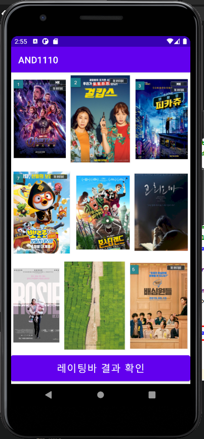 <?xml version="1.0" encoding="utf-8"?> <LinearLayout xmlns:android="http://schemas.android.com/apk/res/android" android:layout_width="match_parent" android:layout_height="match_parent" android:orientation="vertical"> <LinearLayout android:layout_width="match_parent" android:layout_height="0dp" android:layout_weight="3" android:orientation="horizontal"> <ImageView android:id="@+id/iv1" android:layout_margin="5dp" android:layout_weight="1" android:src="@drawable/m1" android:layout_width="wrap_content" android:layout_height="wrap_content" /> <ImageView android:id="@+id/iv2" android:layout_margin="5dp" android:layout_weight="1" android:src="@drawable/m2" android:layout_width="wrap_content" android:layout_height="wrap_content" /> <ImageView android:id="@+id/iv3" android:layout_margin="5dp" android:layout_weight="1" android:src="@drawable/m3" android:layout_width="wrap_content" android:layout_height="wrap_content" /> </LinearLayout> <LinearLayout android:layout_width="match_parent" android:layout_height="0dp" android:layout_weight="3" android:orientation="horizontal"> <ImageView android:id="@+id/iv4" android:layout_margin="5dp" android:layout_weight="1" android:src="@drawable/m4" android:layout_width="wrap_content" android:layout_height="wrap_content" /> <ImageView android:id="@+id/iv5" android:layout_margin="5dp" android:layout_weight="1" android:src="@drawable/m5" android:layout_width="wrap_content" android:layout_height="wrap_content" /> <ImageView android:id="@+id/iv6" android:layout_margin="5dp" android:layout_weight="1" android:src="@drawable/m6" android:layout_width="wrap_content" android:layout_height="wrap_content" /> </LinearLayout> <LinearLayout android:layout_width="match_parent" android:layout_height="0dp" android:layout_weight="3" android:orientation="horizontal"> <ImageView android:id="@+id/iv7" android:layout_margin="5dp" android:layout_weight="1" android:src="@drawable/m7" android:layout_width="wrap_content" android:layout_height="wrap_content" /> <ImageView android:id="@+id/iv8" android:layout_margin="5dp" android:layout_weight="1" android:src="@drawable/m8" android:layout_width="wrap_content" android:layout_height="wrap_content" /> <ImageView android:id="@+id/iv9" android:layout_margin="5dp" android:layout_weight="1" android:src="@drawable/m9" android:layout_width="wrap_content" android:layout_height="wrap_content" /> </LinearLayout> <Button android:id="@+id/btn1" android:layout_width="match_parent" android:layout_height="0dp" android:layout_weight="1" android:textSize="10pt" android:text="레이팅바 결과 확인"/> </LinearLayout>| activity_two.xml
