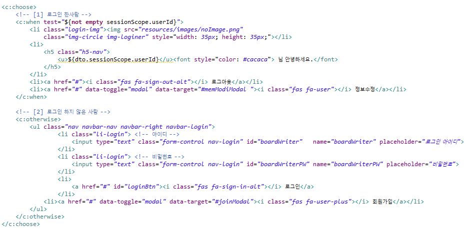 로그인 한 사람과 하지 않은 사람에 대한 구분을 주기 위해 <c:choose> 태그 내에 주석을 달았는데 주석으로 인해 오류가 났다. 자세한 에러 사유도 나타나지 않아서 콘솔을 꼼꼼히 읽어보니 <!--.... 이런식으로 문제가 되는 부분이 발견되서
