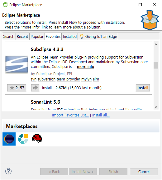 Favorit 패널로 들어가서 조금 밑으로 내리다보면 Subclipse가 있다. Install 버튼을 눌러 다운로드 해준다.